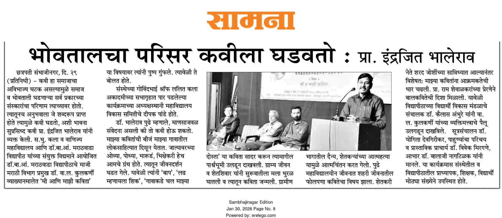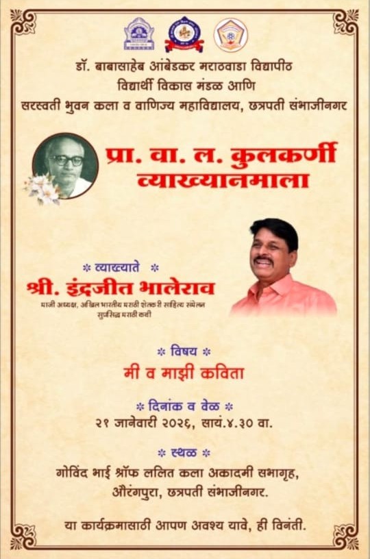 - आज दिनांक २१ जानेवारी २०२६ रोजी सायंकाळी ०४:३० वा. प्रा. डॉ. वा. ल. कुलकर्णी व्याख्यानमालेचे आयोजन.