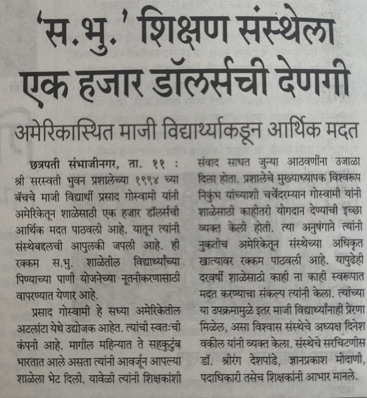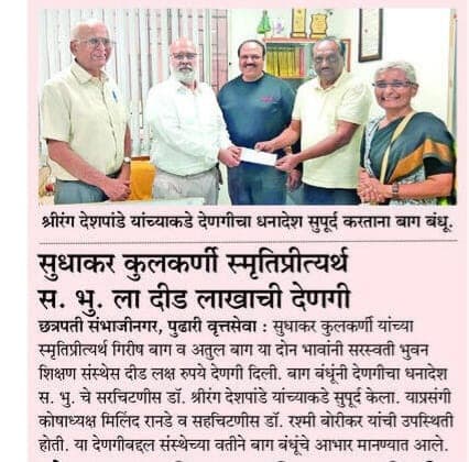 - स.भु. च्या ‘मायेची सावली’ उपक्रमासाठी सी. पी. त्रिपाठी यांची एक लाखाची देणगी.