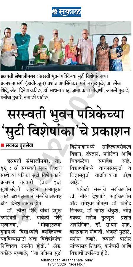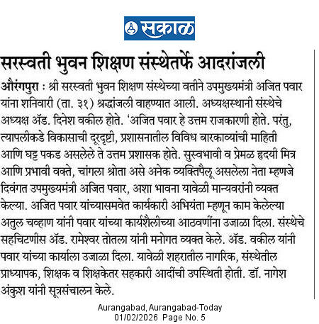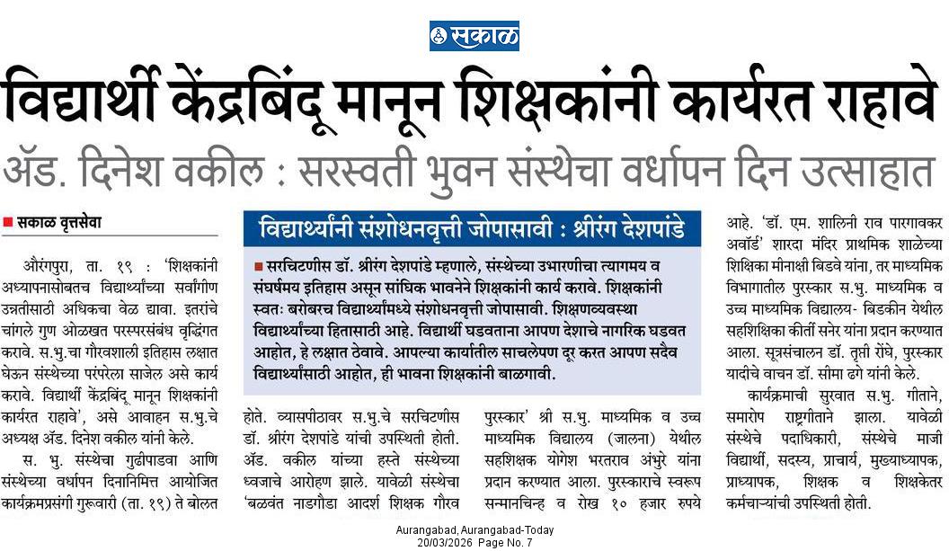 Established in 1915, with just 25 students, this educational institution has now significantly expanded, with approximately 20,000 students receiving education across its 10 secondary schools, 2 primary schools, 2 senior colleges, 1 CBSE school, and 2 hostels. Thousands of our alumni are in forefront in all walks of life in India and abroad. Saraswati Bhuvan Education Society has immensely contributed not only to education but also to uplift the public life of this region. Motivated by the patriotic fervour many of its founding fathers had fought for the freedom of Hyderabad State from the yoke of Nizam regime. Post independence the fulcrum of socio-political-development movements of this region had been SB Education Society. SB, the centennial institution, is still one of the few institutions in the State whose members have made a mark in their respective fields and uphold the value education and social commitment. The glorious traditions and the best practices of the years are still continued by adapting new trends with the changing times thereby making educational development changes. Shri Saraswati Bhuwan Education Society was awarded the first ‘Ideal Educational Institution – State Award for Meritorious Public Service in the Educational and Social Sector’ in 2000 by the Government of Maharashtra. Our educational institution holds a prestigious position not just in Marathwada but across Maharashtra.