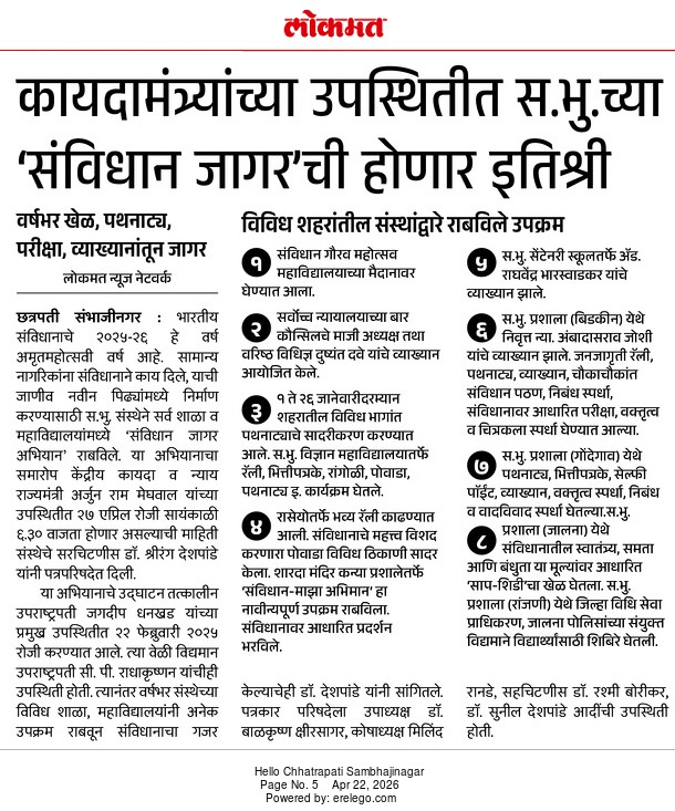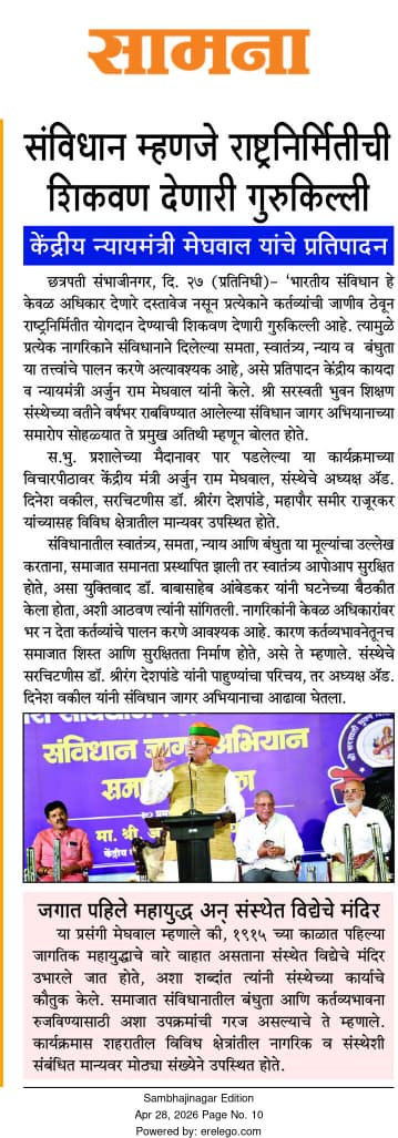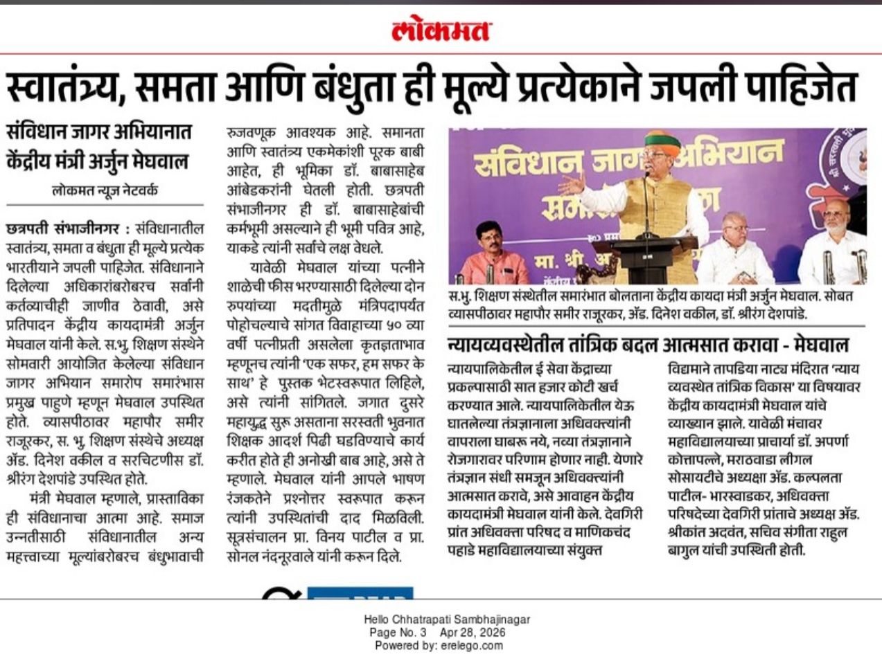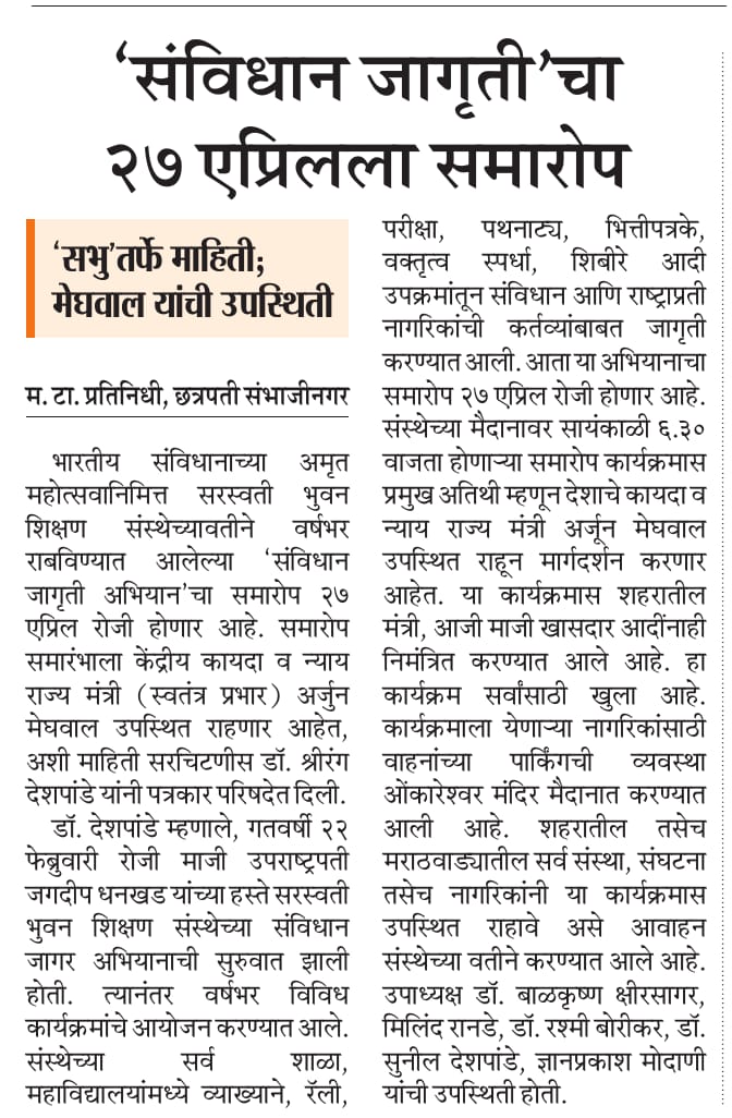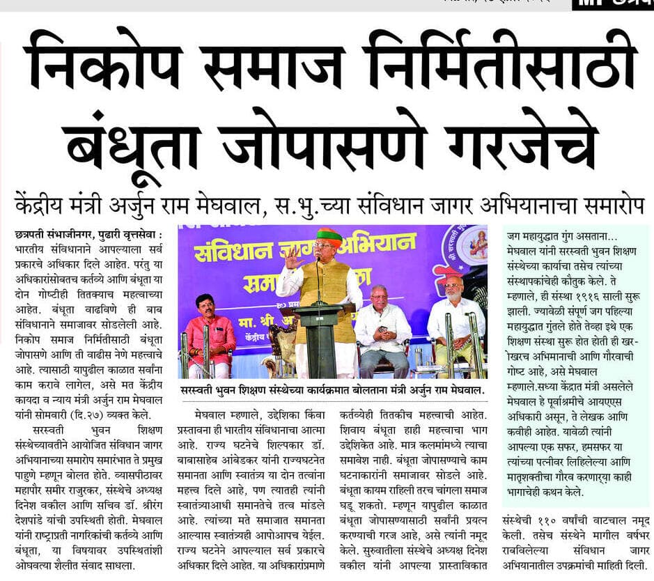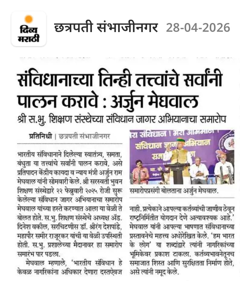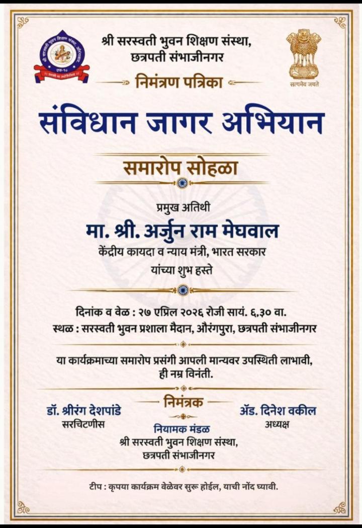 स. भू. शिक्षण संस्था, छत्रपती संभाजीनगर येथे “संविधान जागर अभियान” समारोप सोहळा मा. केंद्रीय कायदा व न्याय मंत्री श्री. अर्जुन राम मेघवाल यांच्या प्रमुख उपस्थितीत संपन्न होणार.