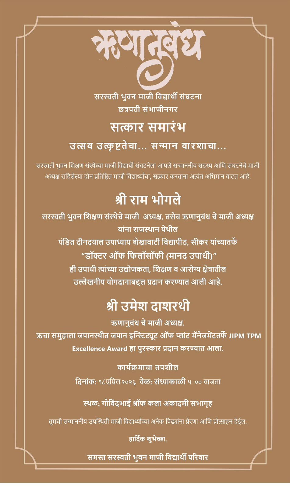 स. भू. शिक्षण संस्था, छत्रपती संभाजीनगर माजी विद्यार्थी संघटना आयोजित स्नेहबंध स्नेहसंमेलन कार्यक्रमात मा. श्री. राम भोगले यांना मानद “डॉक्टर ऑफ फिलॉसॉफी” उपाधी व श्री. उमेश दाशरथी यांना JIPM TPM Excellence Award प्रदान; कार्यक्रम दिनांक १८ एप्रिल २०२६ रोजी संपन्न होणार.